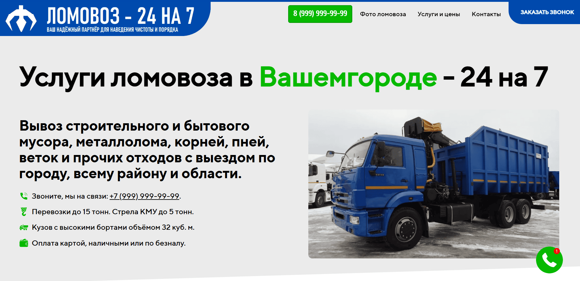 Первый экран сайта может выглядеть иначе. Например, вместо текущей картинки с Камазом, можно загрузить фотографию именно вашего ломовоза, который в свою очередь может быть представлен либо один, либо с вашей личной фотографией на его фоне.